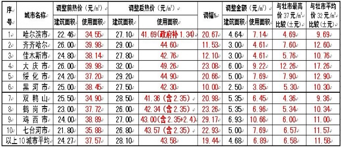 貫徹國家三部委和省政府關(guān)于啟動(dòng)煤熱價(jià)格聯(lián)動(dòng)機(jī)制要求,2008年哈爾濱、齊齊哈爾、佳木斯、大慶、雞西、雙鴨山、鶴崗、綏化等8城市都調(diào)整了熱價(jià),2009年七臺河市、伊春市調(diào)整了熱價(jià),2010年黑河市也調(diào)整了熱價(jià),見下表: