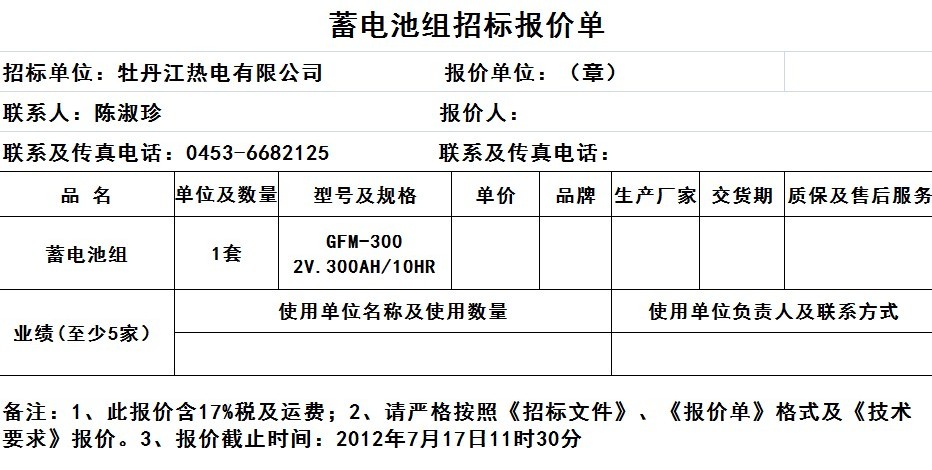 牡丹江熱電有限公司西城供熱公司,需購(gòu)買蓄電池組GFM-300 2V.300AH/10HR一套,現(xiàn)進(jìn)行公開招標(biāo),誠(chéng)摯地歡迎有資質(zhì)的生產(chǎn)及經(jīng)營(yíng)單位參與投標(biāo)。
